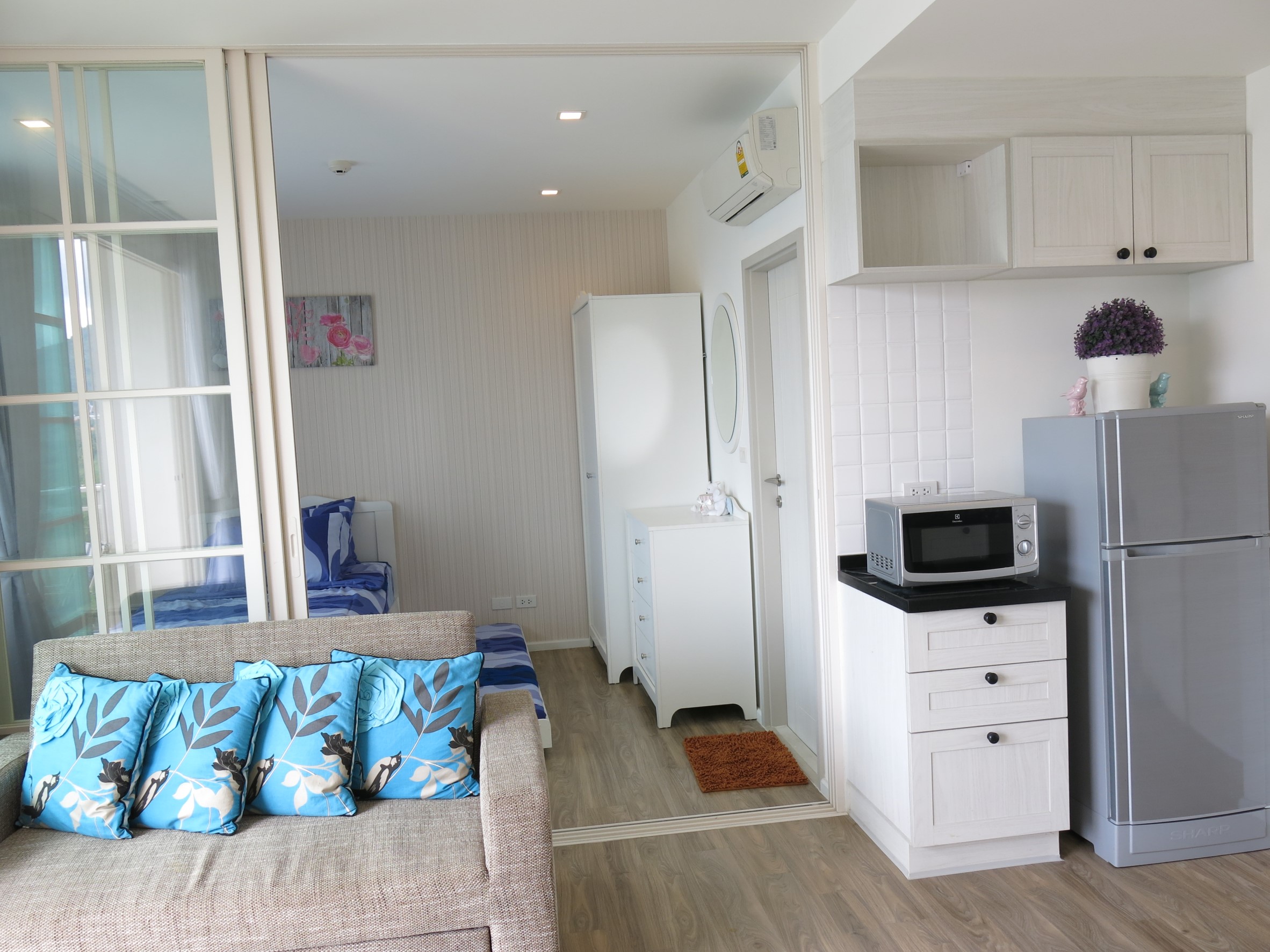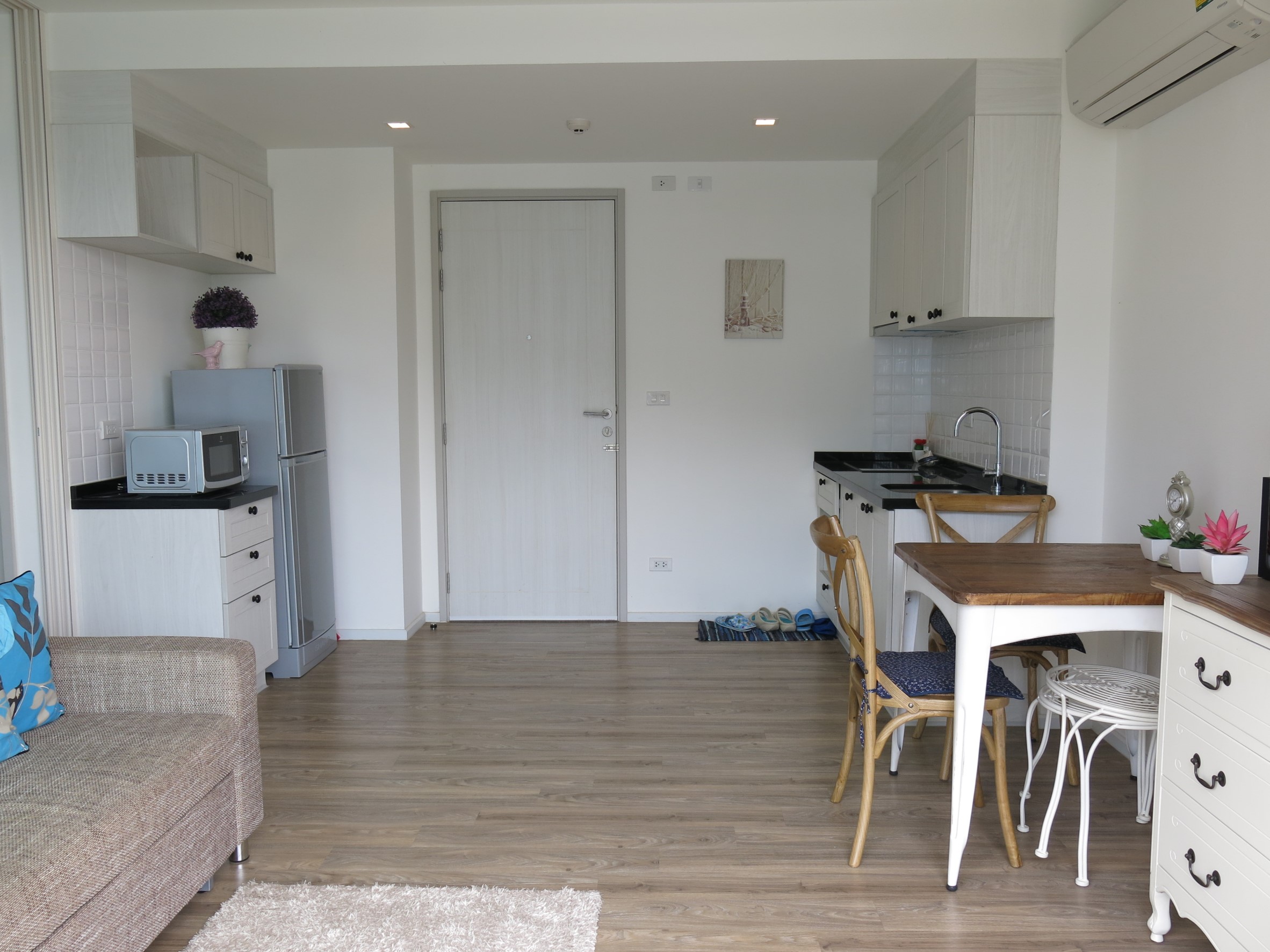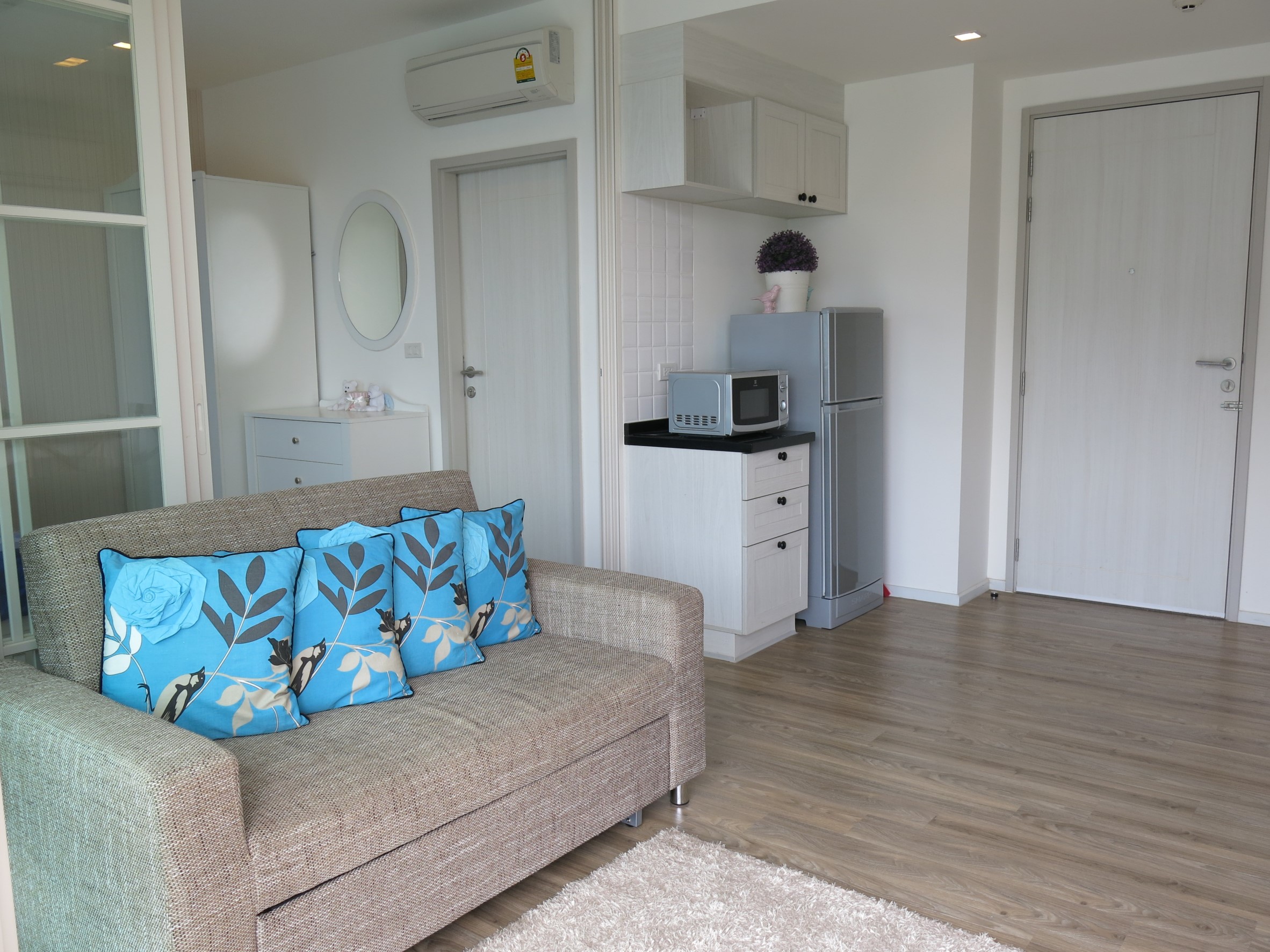 This 1 bedroom 45 sqm condo is located a short walk from Cicada market. The condo which has been tastefully decorated in a modern style is located on the 5th floor and has 1 bedroom, 1 bathroom and a open plan living/kitchen area.