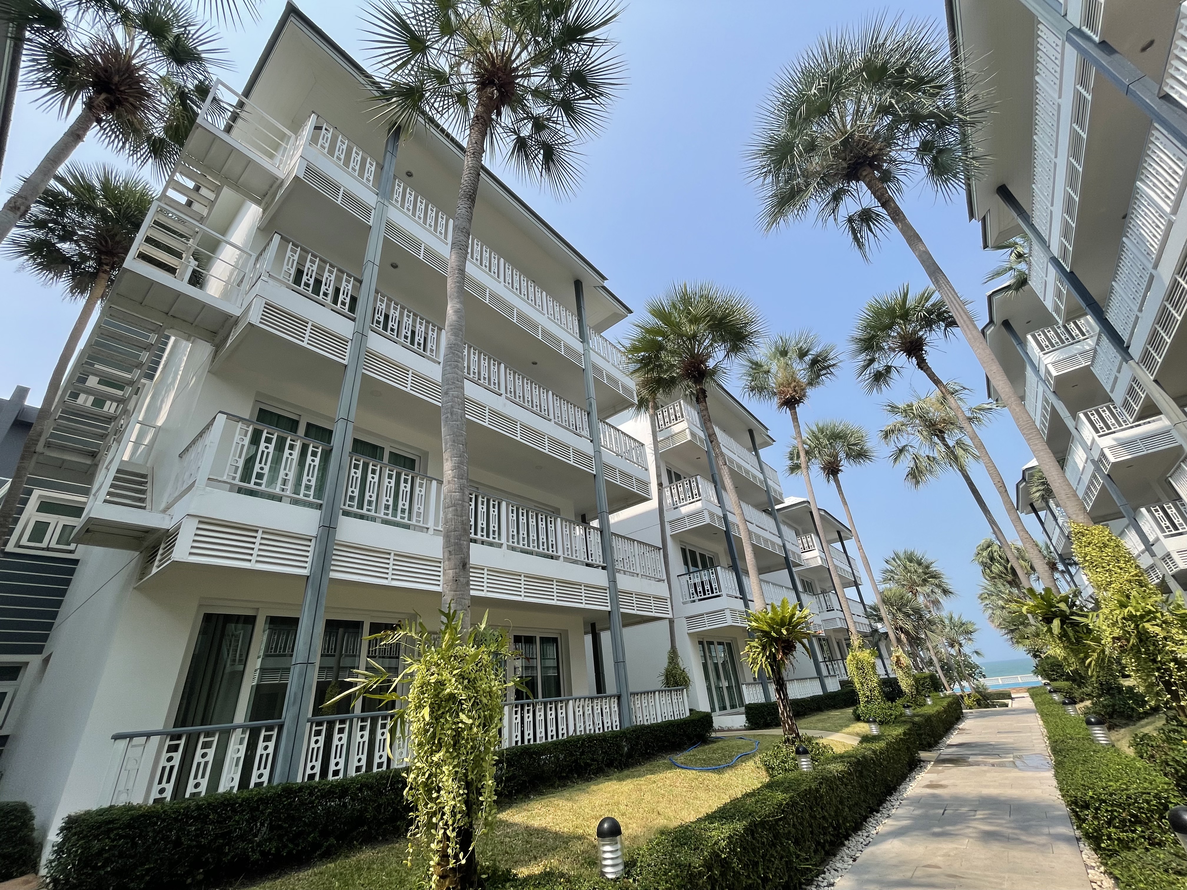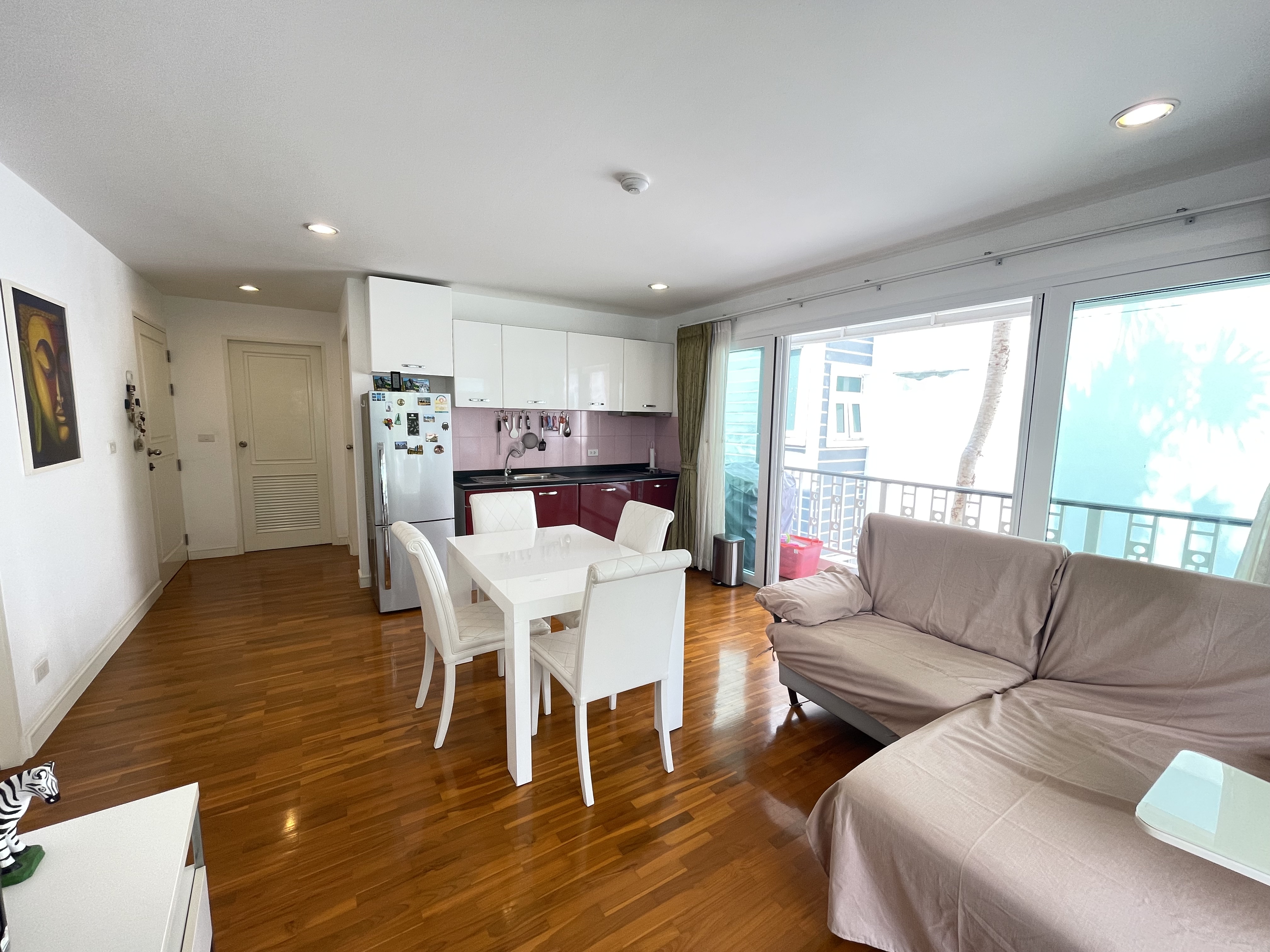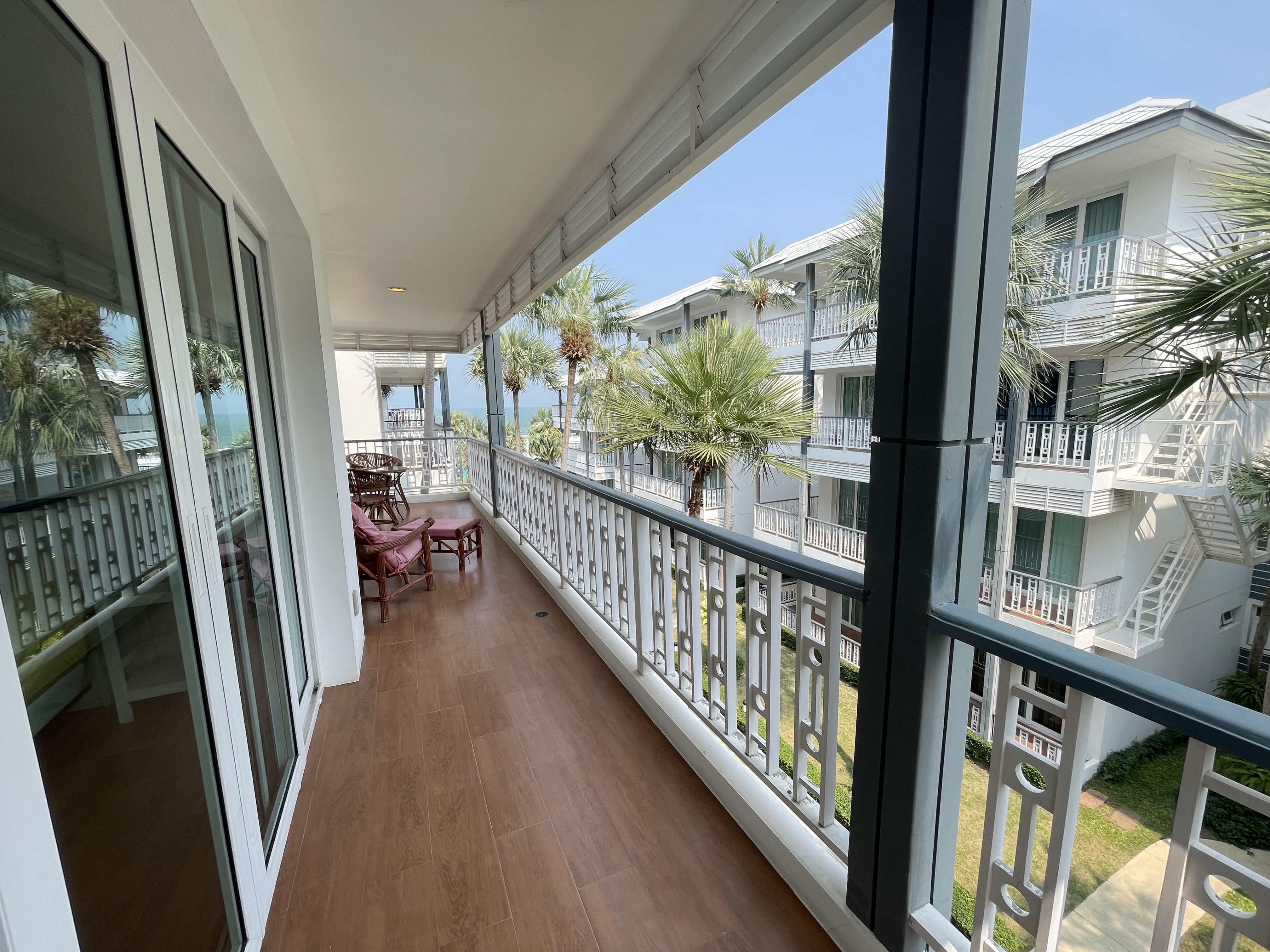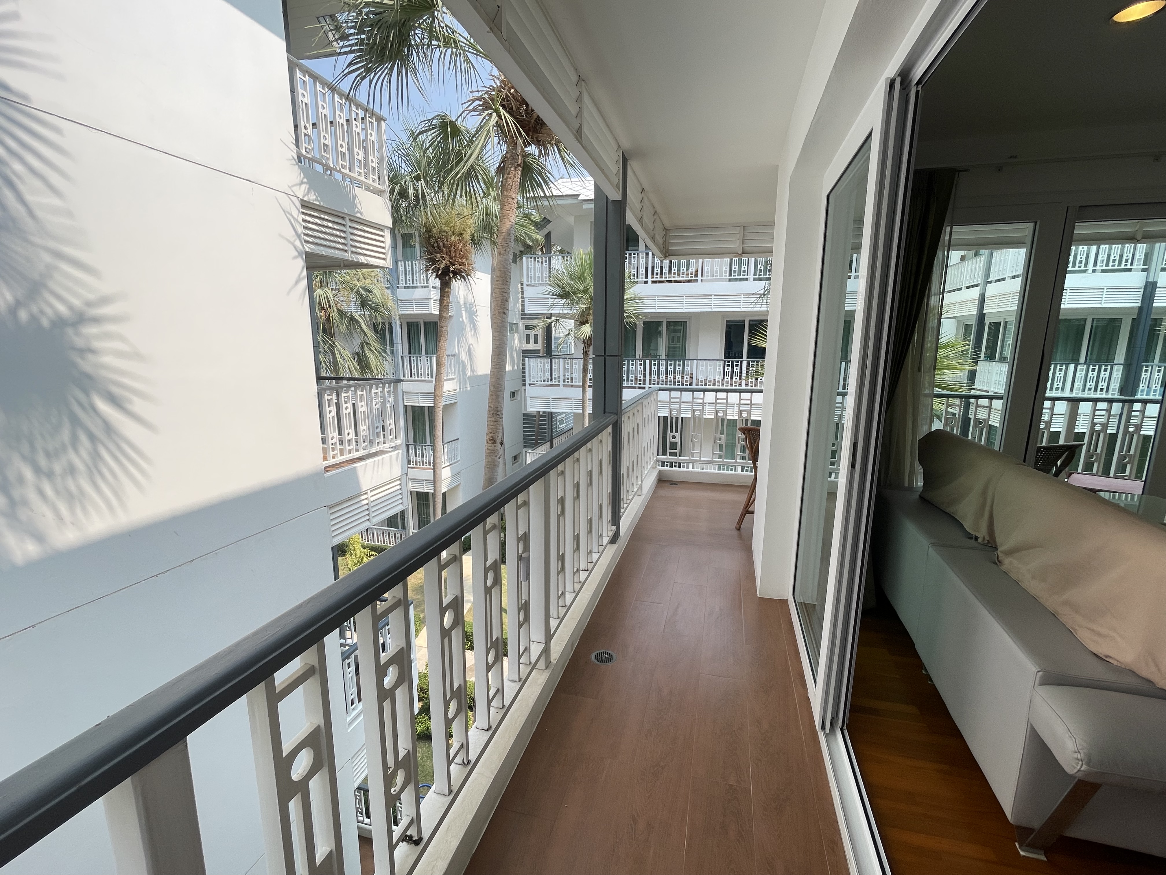 This 80 square meters 2-bedroom condo is located on the third floor and offers sea view from the balcony. If you are looking for tranquility and yet do not want to live away from the city, this apartment is ideal. It is located in the famous district of Khao Takiab in the south of Hua Hin. The apartment is just 50 meters from the sea and very many restaurants of all kinds, small stores, shopping, the terminus of the green bus line called Songtheaw, as well as the popular Tamarind and Cicada weekend night markets are within walking distance.